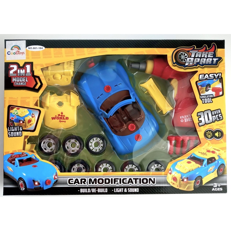 • CUSTOMIZED CAR: This 2-in-1 DIY build a car toy playset allows your child to build and customize their very own race car. With 30 pieces, including car parts, modification parts, 8 tires, drill, drill bit and screws, the possibilities are endless.
