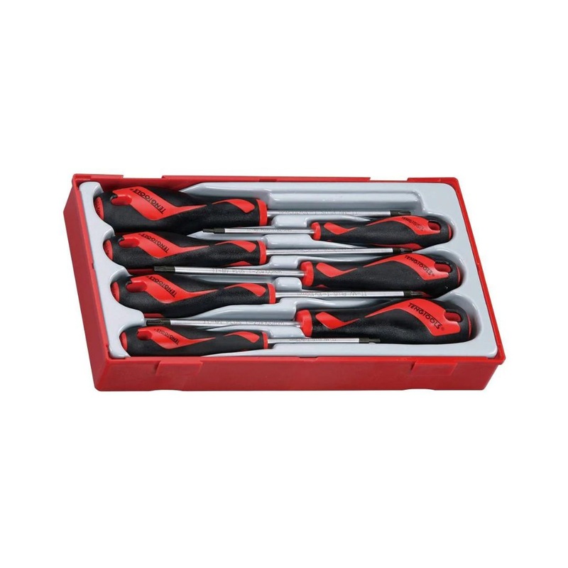 7 piece driver tray covering TX8 through to TXP30Features include TT-MV PLUS steel blades and ergonomically designed bi-material handles with hanging hole and T drive facility for added torque and comfortSupplied in the unique Teng Tools Tool Tray with rem