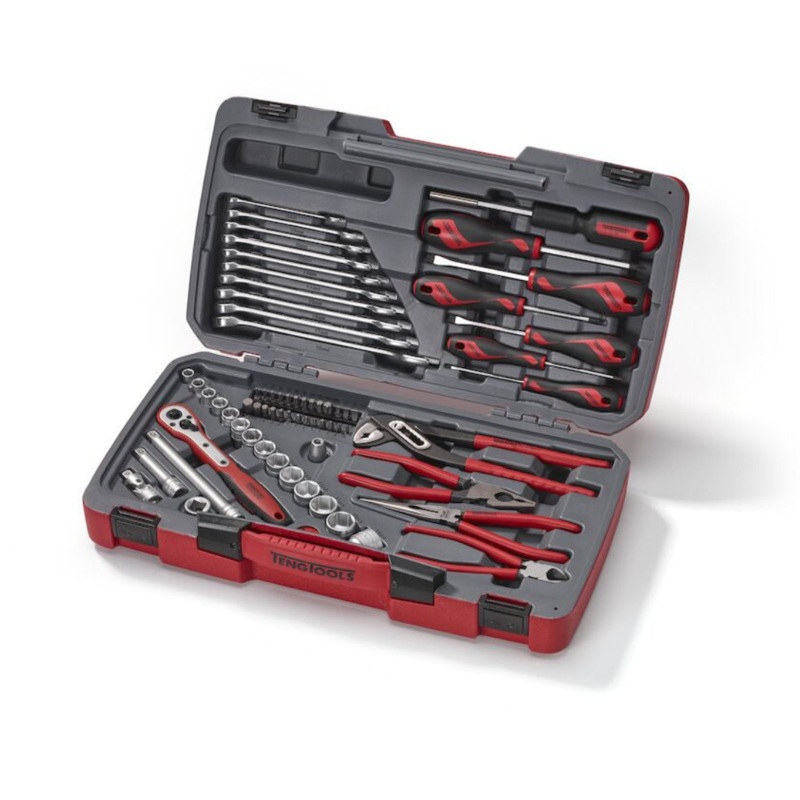 67 piece 3/8" drive tool set containing regular 6 point metric sockets, FRP ratchet, universal joint, 3" and 6" extension bars, coupler adaptor, 1/2" - 3/8" adaptor, bits driver with magnetic bits holder, 10 combination spanners, 6 screwdrivers, 4 pliers a