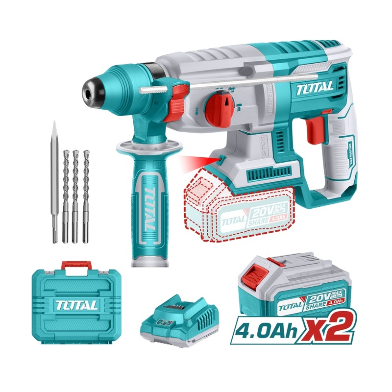 TOTAL Cordless 20V Rotary Hammer Drill Brushless 26mm + Battery & ChargerBrushless motorVoltage: 20VNo-load speed:0-1100rpmImpact rate:0-5000bpmImpact energy:2.5JMax drilling capacity: Concrete 26mm, Steel 13mm, Wood 30mmSDS Plus chuck systemIntergrated LE
