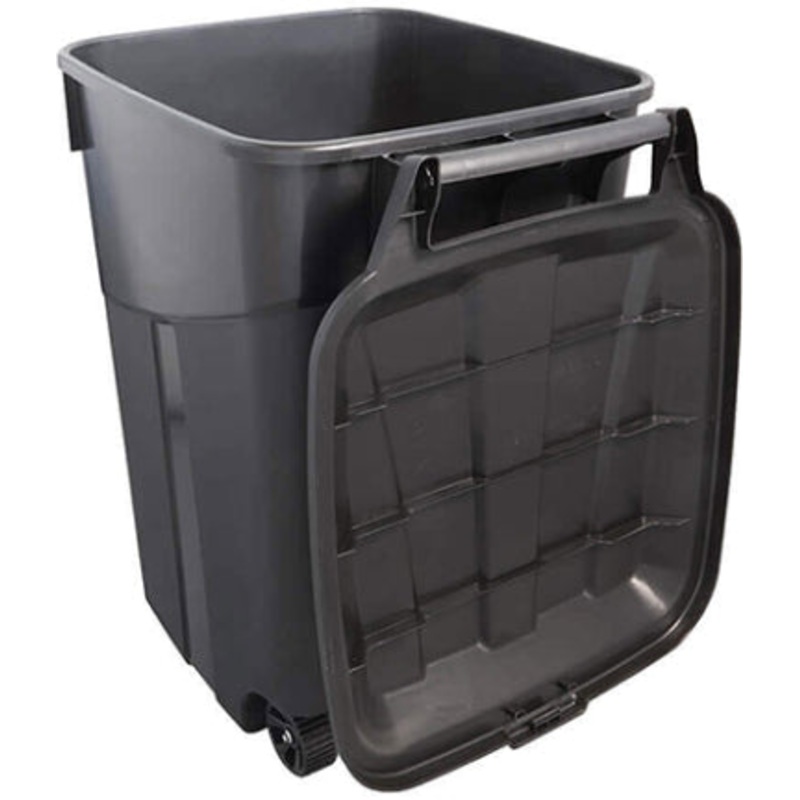 45 Gallon/170.3 Liter Wheeled Injection Molded Trash Can. Attached, click lock, hinged lid, heavy-duty, easy-grip handle, bottom hand groove, rugged wheels, impact resistant and easy clean material.