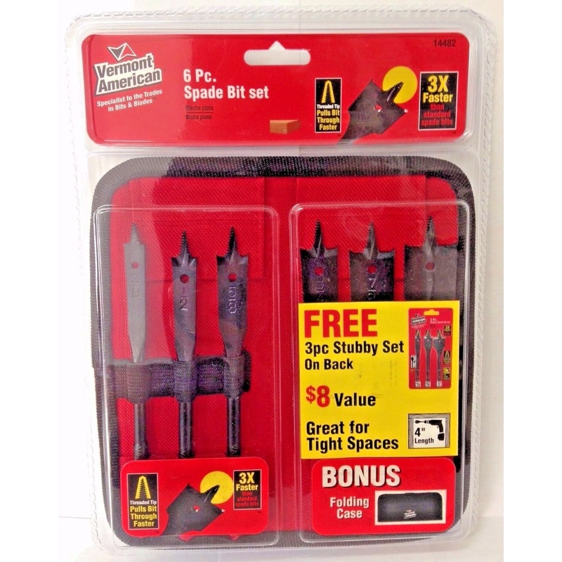 Vermont American 14482 6 Piece Spade Bit Drill Bit Set + 3 Piece Stubby SetIncludes: 3/8", 1/2", 5/8", 3/4", 7/8", 1"Stubby: 1/2", 3/4", 1"Threaded tip pulls bit through faster.Bonus folding case