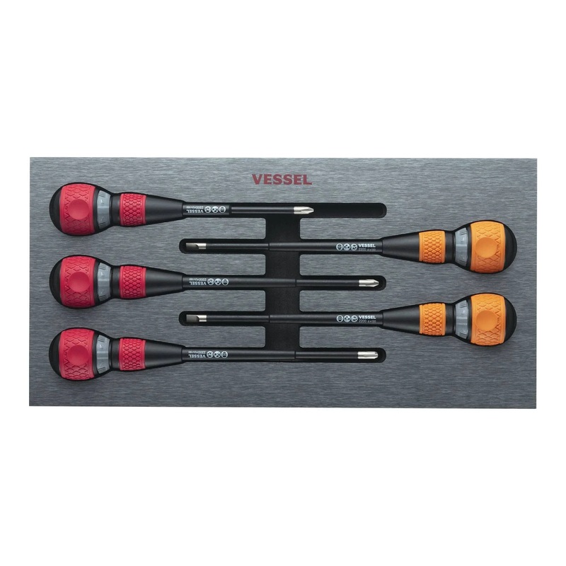 5PieceSet of BALL GRIP Ratchet Screwdriver No.2200 in EVA foam inlayErgonomic BALL GRIP for anti-fatigue and various way of drivingFunctionally enhanced BALL GRIP with 36-teeth gear ratchet for smooth driving by simple repeated finger or wrist movementNon-