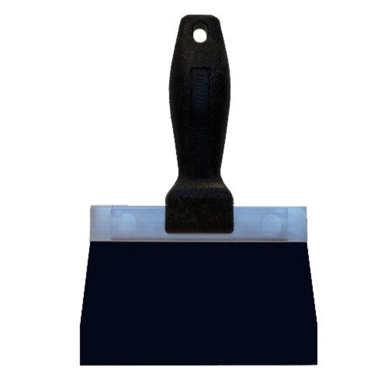 Aluminum backing provides blade rigidity while making these knives up to 40% lighter than standard taping knives. Polypropylene handle is molded to the extruded aluminum backing plate so it cannot come loose. Blade flares out at edges to reach into corners. Blue steel or stainless steel blades.