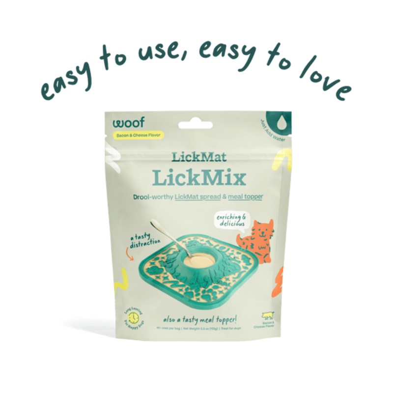 Just scoop, mix, and spread for a delicious distraction! LickMix lets your dog lick away their stress, which is shown to promote calm in anxious pups. Just scoop it out and add water to create a jello-like consistency thats easy to spread and ready to serve in secondsno freezer required! Plus, its way easier to clean than traditional lick mat spreads like peanut butter or yogurt. Pair with the Woof LickMat to calm your pup during bathtime, dinnertime, or any other occasion that calls for a delicious distraction.